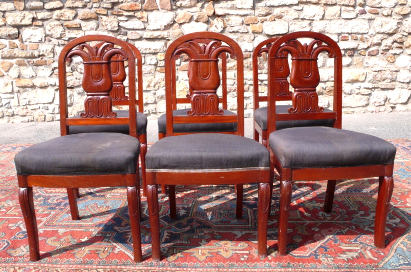 Nabízíme vám šest židlí Art Deco z květinovými motivy. Dřevo mahagon, datace:1920.