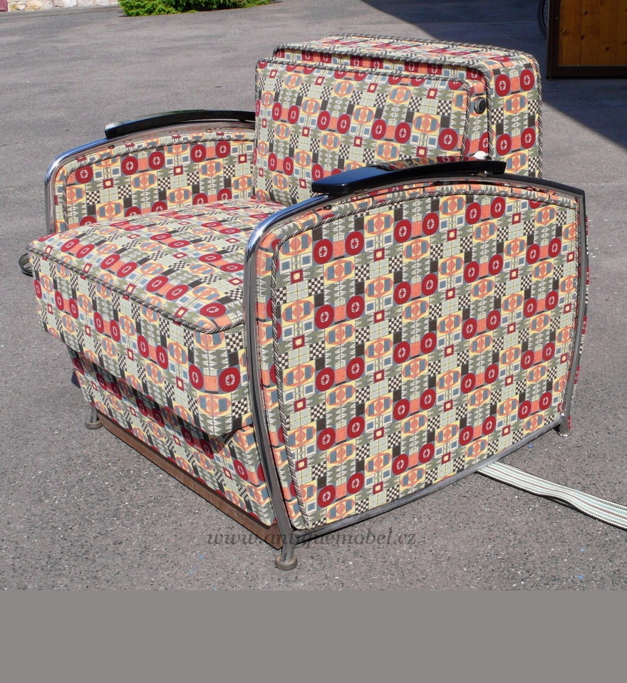 Křeslo a pohovka. Chromovaný nábytek trubkový. Křeslo je opraveno včetně nového chromu, látky a polstrování. Funkcionalismuz.