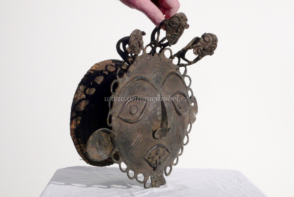 maska je odlitá z bronzu.Zobrazuje muže jako slunce a hlavu rodiny. Stáří 100-150 let. Původ-severní Afrika