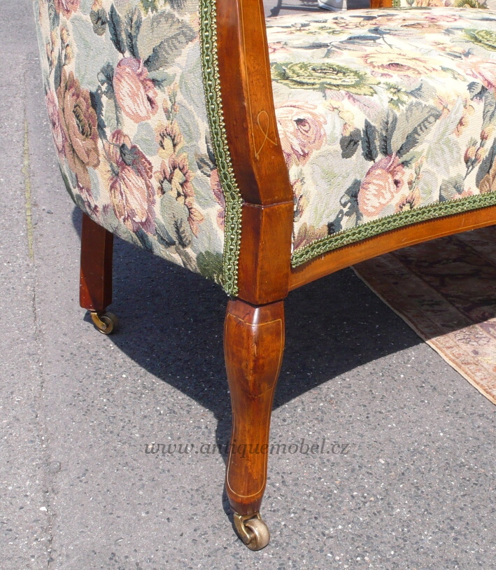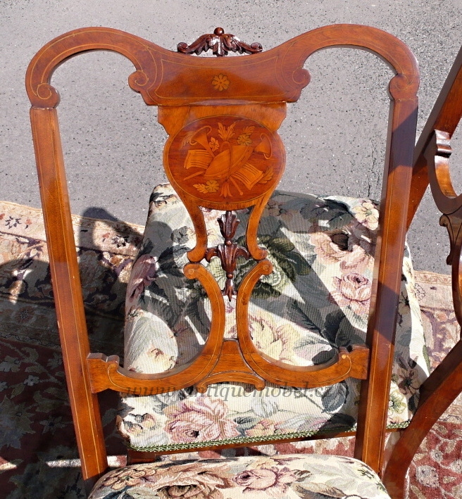 Nabízíme Vám zámecký hudební salonek. Nábytek je bohatě intarzovaný hudebními motivy, vše původní. Nábytek je opraven, povrchová úprava šelak + nová látka, pera a polstrování, 100% stav.