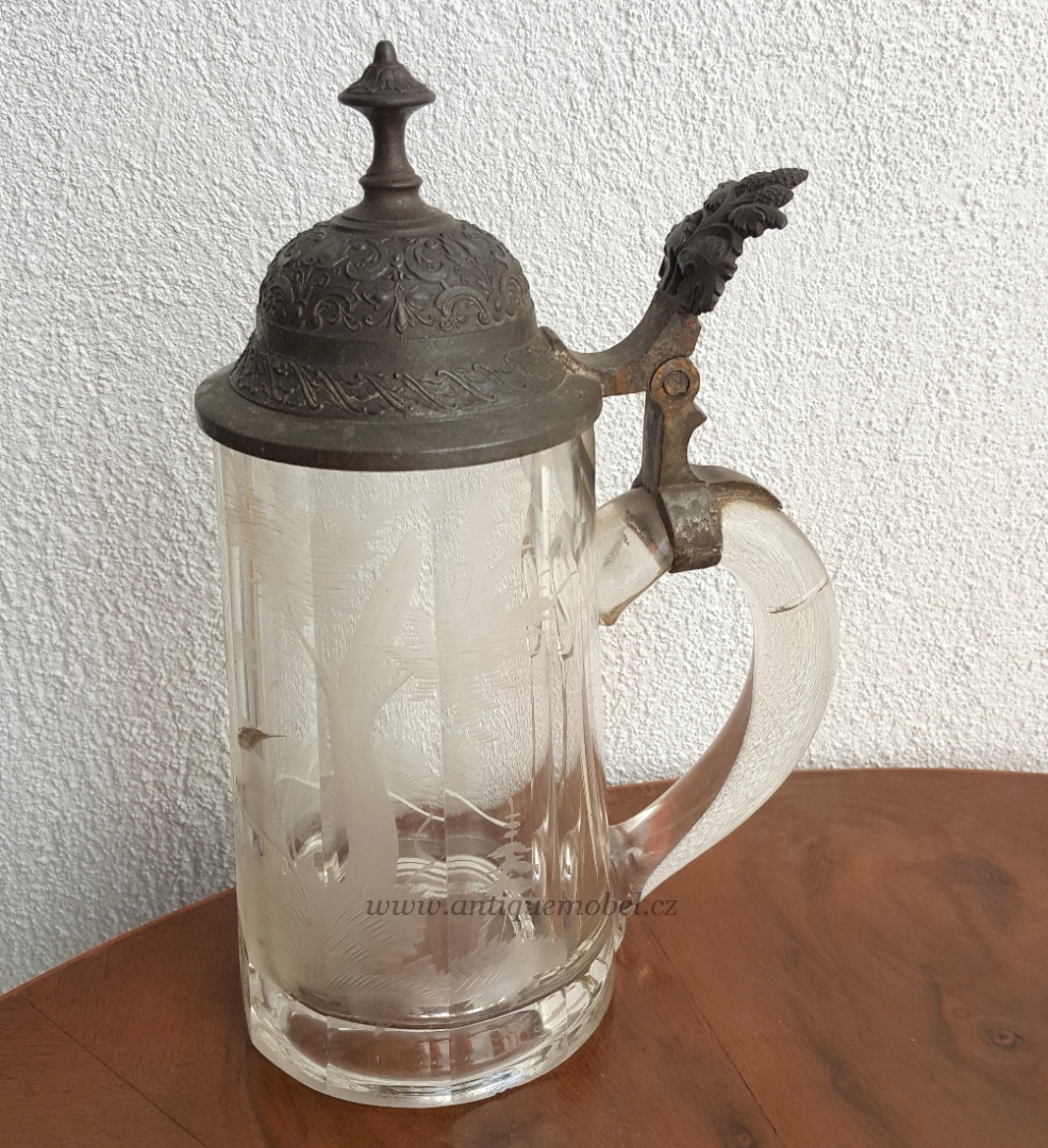 Pivní Korbel zdobený jelenem. Starožitnosti Antik Praha Mikšík