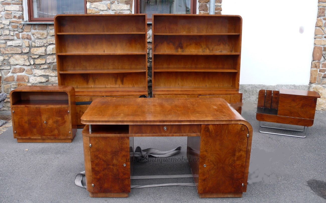 Jindrich Halabala. Pracovna, (kancelář) Soubor obsahuje : knihovnu, sklenik, pracovní stůl, křeslo. Skla v knihovně mají zabroušene fazety. Kování nerez, dýha : kavkazský ořech. Nábytek je ve výborném původním stavu.